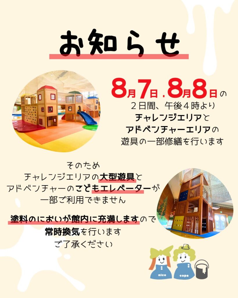 チャレンジエリアとアドベンチャーエリアの遊具の一部修繕を行います。