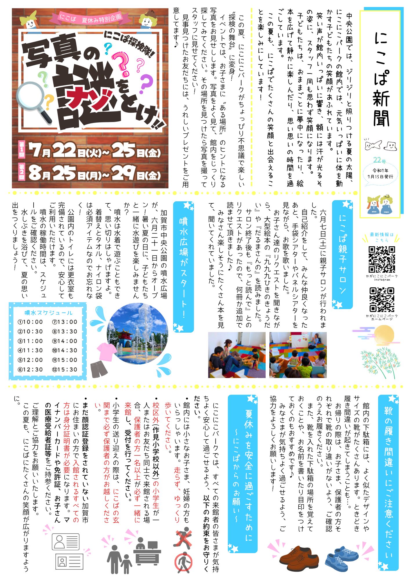 にこぱ新聞22号発行 2025 7/15 にこぱ新聞 2025年7月15日 にこぱ新聞 URLをコピーしました! 加賀市中央公園【おとぎの国】噴水スタートのお知らせ 館内遊具一部修繕のお知らせ 関連記事 にこぱ新聞25号 発行 2026年1月19日 にこぱ新聞24号 発行 2025年11月15日 にこぱ新聞23号発行 2025年9月15日 にこぱ新聞21号発行 2025年5月15日 にこぱ新聞20号発行 2025年3月15日 にこぱ新聞19号 発行 2025年1月15日 にこぱ新聞18号 発行 2024年11月15日 にこぱ新聞17号発行 2024年9月15日